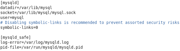MySQL al igual que apache tiene un archivo de configuración principal, este se encuentra en la ruta /etc/ y se llama my.cnf. Como se ve en la imagen de abajo el contenido es bastante corto y entendible. Los puntos de configuración a destacar de este archivo son los siguientes.