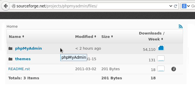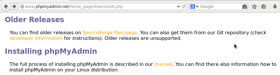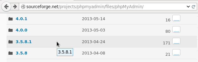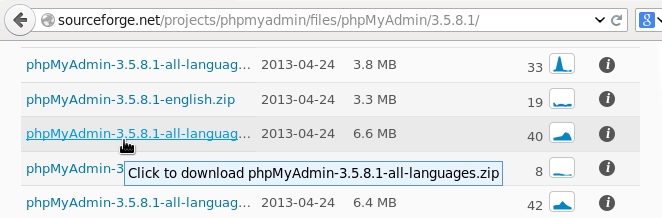 Desde la página principal de phpMyAdmin se hace click en el botón Download que está en el menu superior, luego al final de la página de descargas, en la sección Older Releases (Lanzamientos Anteriores) habrá un enlace que se llamará SourceForge files pages, que dirigirá la navegación hacia todas las versiones de phpMyAdmin lanzadas. Se accede al enlace phpMyAdmin y se busca la versión 3.5.8.1, se accede a este enlace y desde esta última página se descarga el paquete phpMyAdmin-3.5.8.1-all-languages.zip.