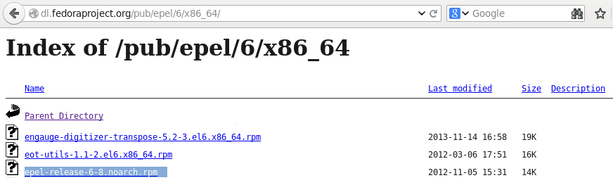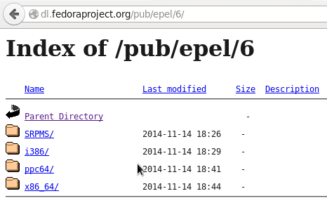Para descargar el repositorio epel, se debe ingresar a http://dl.fedoraproject.org, especificamente en el enlace http://dl.fedoraproject.org/pub/epel/6/ el cual lleva a los paquetes disponibles para la versión 6 de centos, en esta página se debe seleccionar la arquitectura de la maquina en la que se va a instalar y en la siguiente página se debe buscar el paquete llamado epel-release-6-8.noarch.rpm y se descarga.