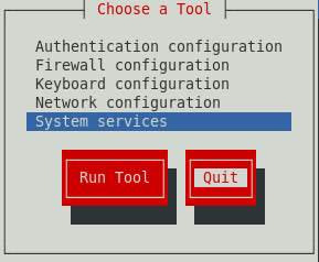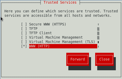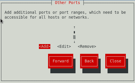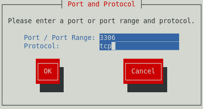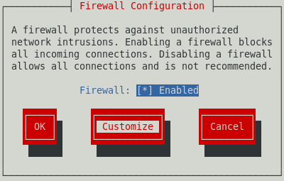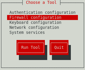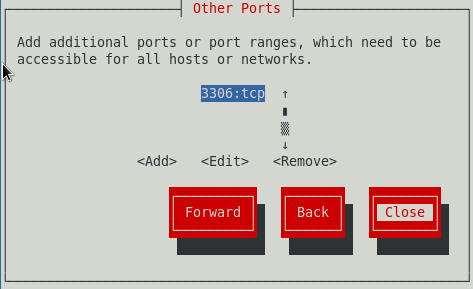 Ahora se debe habilitar el firewall para poder usar correctamente mysql en red, para ello con el comando setup se puede acceder al panel de configuración como se ve en la imagen siguiente; se accede a la configuración de firewall (asegurandose de que esté activo), luego se ingresa a la sección Customize (personalizar) y si mysql no se encuentra en la lista entonces se accede a la sección Forward (adelante o siguiente) y se agregar un nuevo puerto para que pueda ser accesado por otros hosts a traves de la red, el puerto debe ser 3306 tcp (tcp en minusculas). Por ultimo se cierra el setup y se reinicia el firewall.